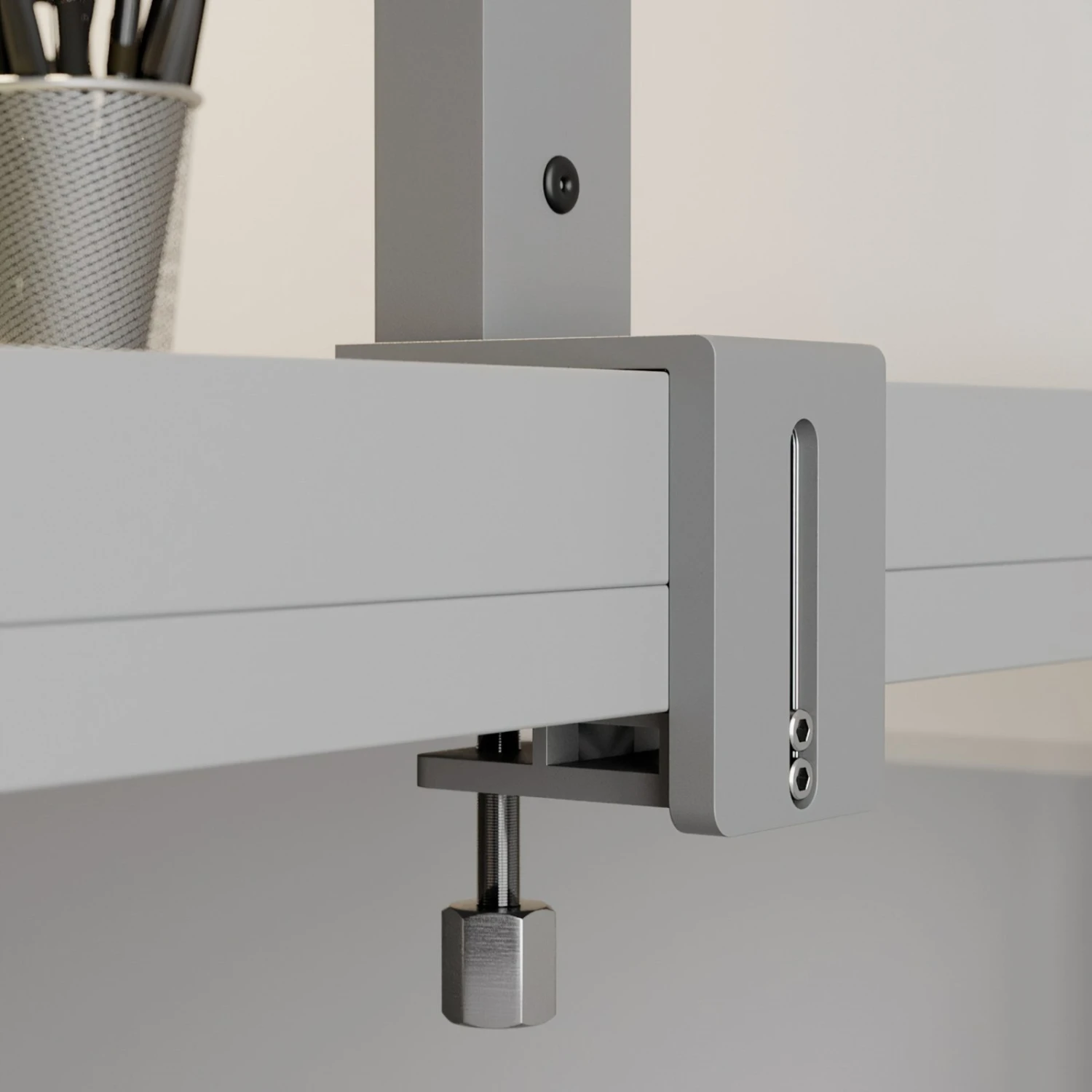 Lampe de bureau à LED argentée Jolinda avec variateur tactile et lumière directe-indirecteAvec son pied de serrage pour une installation sur un bureau dans un bureau ou un environnement professionnel, la lampe de bureau à LED Jolinda est en quelque sorte une innovation en matière d’éclairage de bureau. Les LED blanc universel – une très bonne couleur de lumière pour les activités de bureau – diffusent leur lumière aussi bien vers le haut que vers le bas, la plus grande partie de la lumière étant diffusée indirectement vers le haut dans la pièce, ce qui donne une image lumineuse très naturelle, propice au travail et à la concentration. La partie directe de la lumière se distingue en outre par le fait qu’elle minimise quasiment l’éblouissement et que l’on ne doit pas craindre d’effets lumineux gênants lors du travail. De plus, la lumière ne scintille pas, ce qui permet d’obtenir une qualité de lumière optimale pour se concentrer sur son travail. Caractéristiques techniques : – dimmable par touchpad sur le support de la lampe- lumière sans scintillement- couleur de lumière blanc universel pour un travail concentré- pied de serrage intégré avec pince à vis pour la fixation sur le poste de travail au bureau (pour des épaisseurs de table de 1,5 cm à 7 cm)- lumière anti-éblouissante (UGR6)- composante directe et indirecte de la lumière- lumière indirecte vers le haut avec un angle de rayonnement de 110°- lumière directe vers le bas avec un angle de rayonnement de 50°- degré de résistance aux chocs IK06