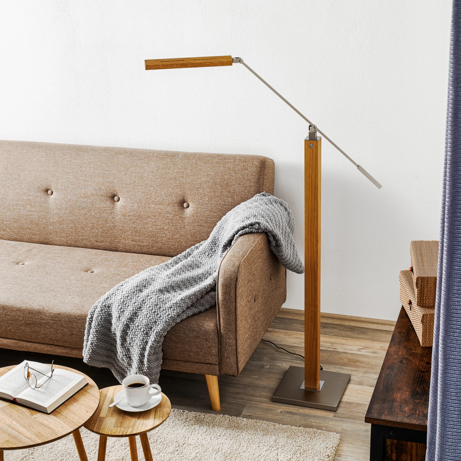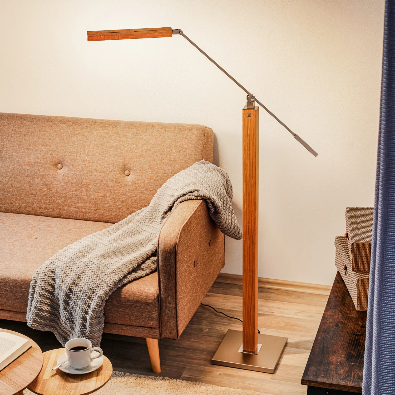 La base carrée en métal de couleur nickel et le support en bois massif donnent au lampadaire à LED Otto O une base solide. Au sommet se trouve une tige métallique filigrane, qui supporte la tête de la lampe avec l’élément lumineux LED à l’extrémité longue. En face se trouve un contrepoids métallique allongé qui maintient en équilibre le bras pivotant de la lampe. L’ensemble du bras de la lampe peut pivoter et s’incliner, de sorte que la lampe offre un éclairage polyvalent. La hauteur relativement faible du luminaire pour un lampadaire a été délibérément choisie afin de fournir un éclairage le moins éblouissant et le plus ciblé possible pour la lecture.