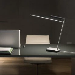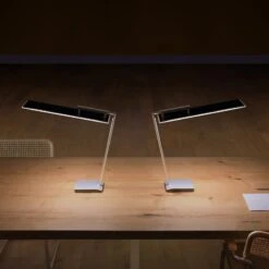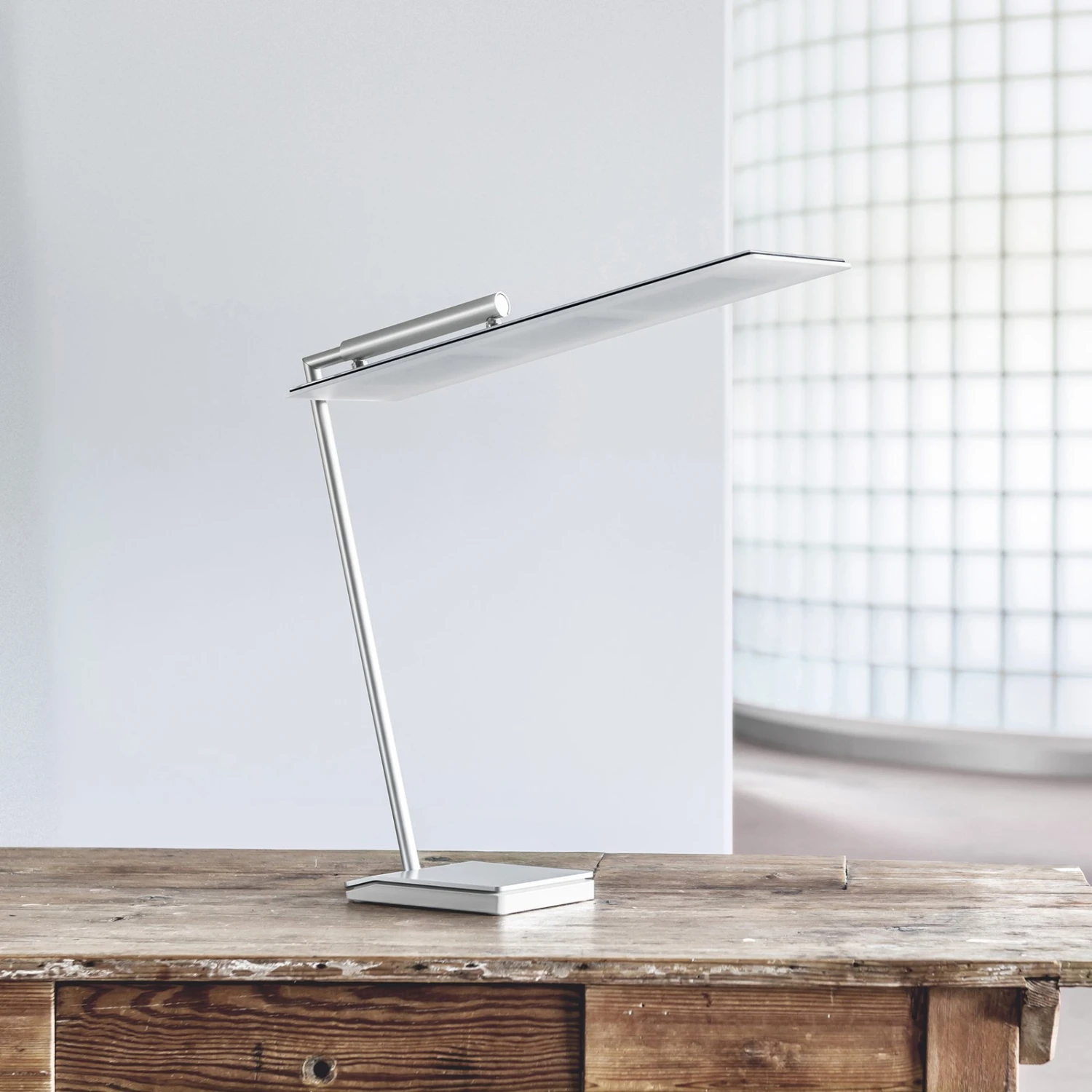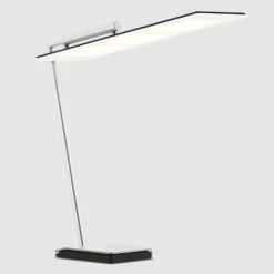 La tĂŞte de lampe ultra-plate fait saillie sur la surface de travail et l’Ă©claire de manière claire et non Ă©blouissante, crĂ©ant ainsi une atmosphère agrĂ©able avec une lumière de travail non Ă©blouissante, claire, sans UV ni IR. Le design minimaliste donne Ă la lampe de bureau une touche très moderne.
