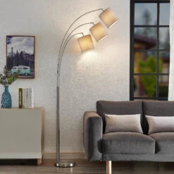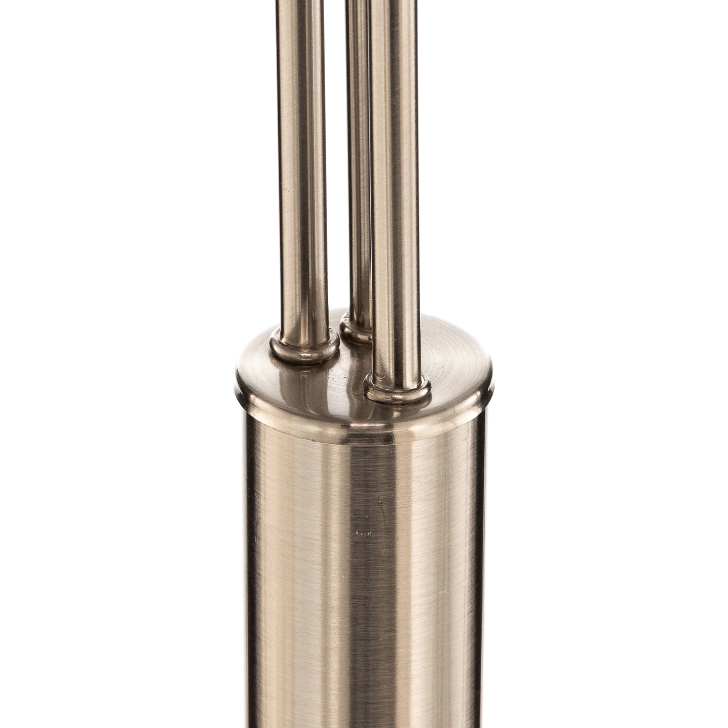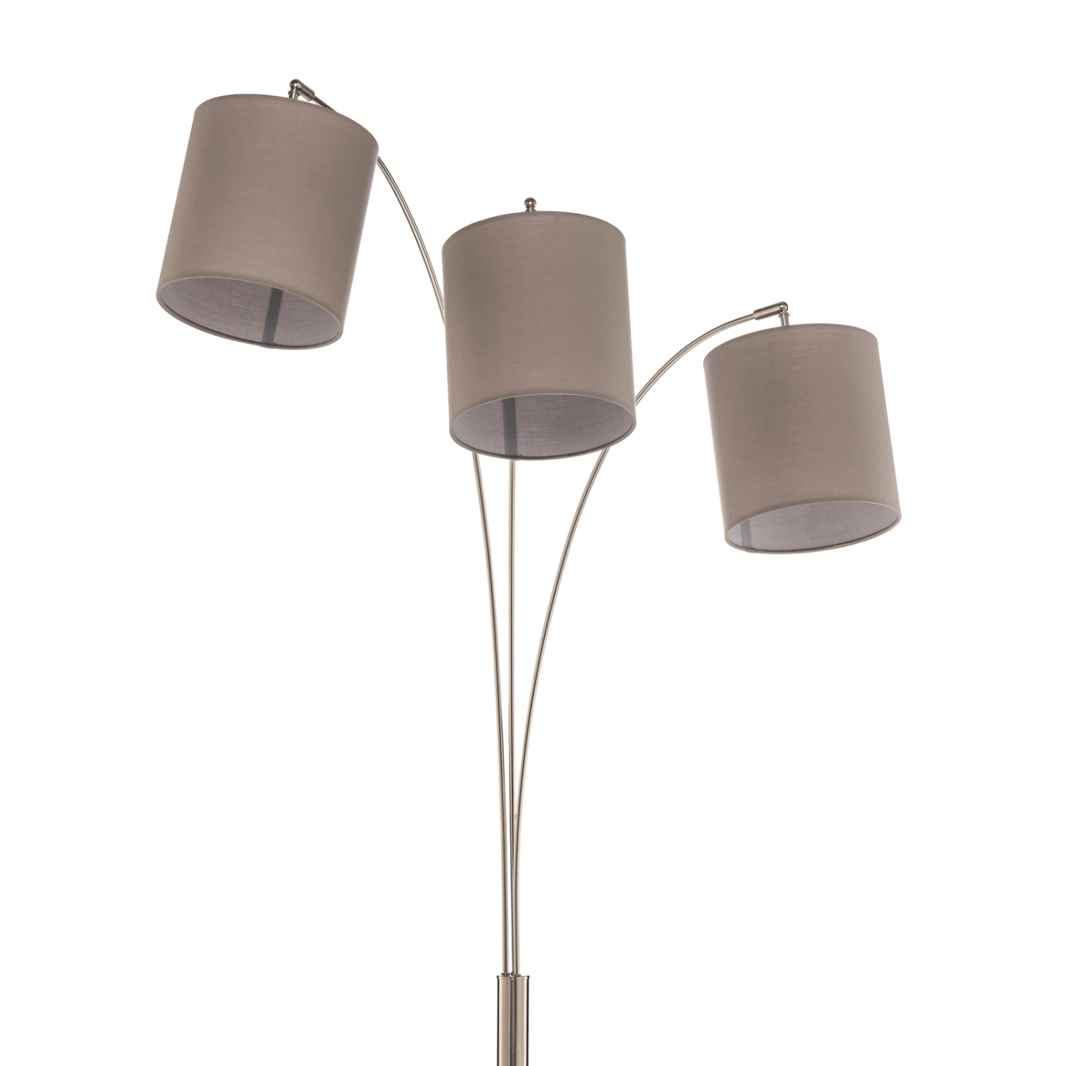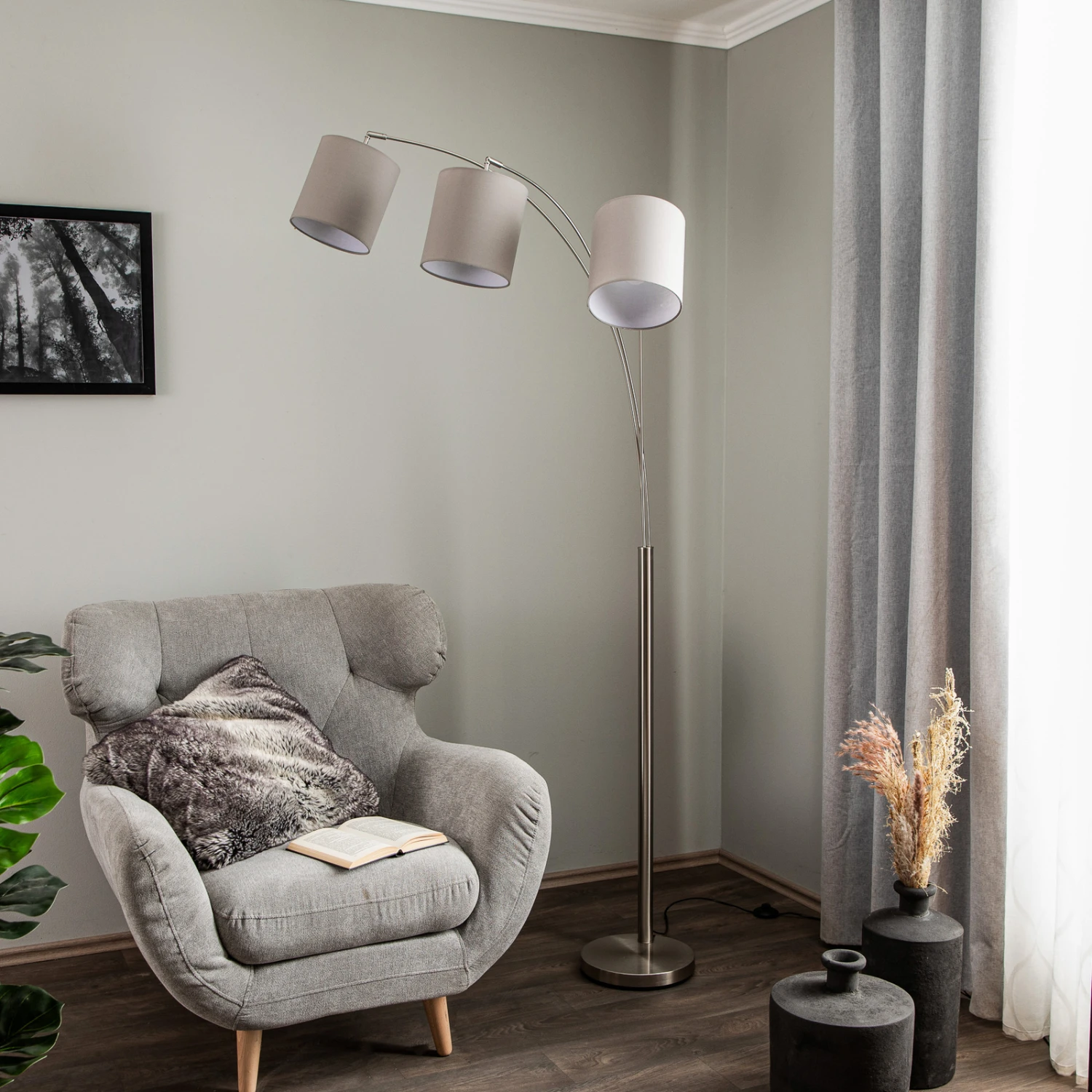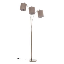 Nanika est un lampadaire moderne qui séduit par son design élancé et qui, grâce à ses couleurs discrètes, peut s’harmoniser à merveille avec les concepts de couleurs les plus divers. La structure de couleur nickel avec un pied rond en acier offre à ce lampadaire un appui stable sur le sol. Les trois bras de la lampe sont conçus en filigrane et courbés avec style, leur position pouvant être réglée à volonté selon les besoins. L’utilisateur peut ainsi décider à chaque fois de l’endroit où les trois sources lumineuses doivent diffuser leur lumière. Les abat-jour de forme cylindrique en textile ont été conçus dans la couleur taupe, qui complète discrètement le design.