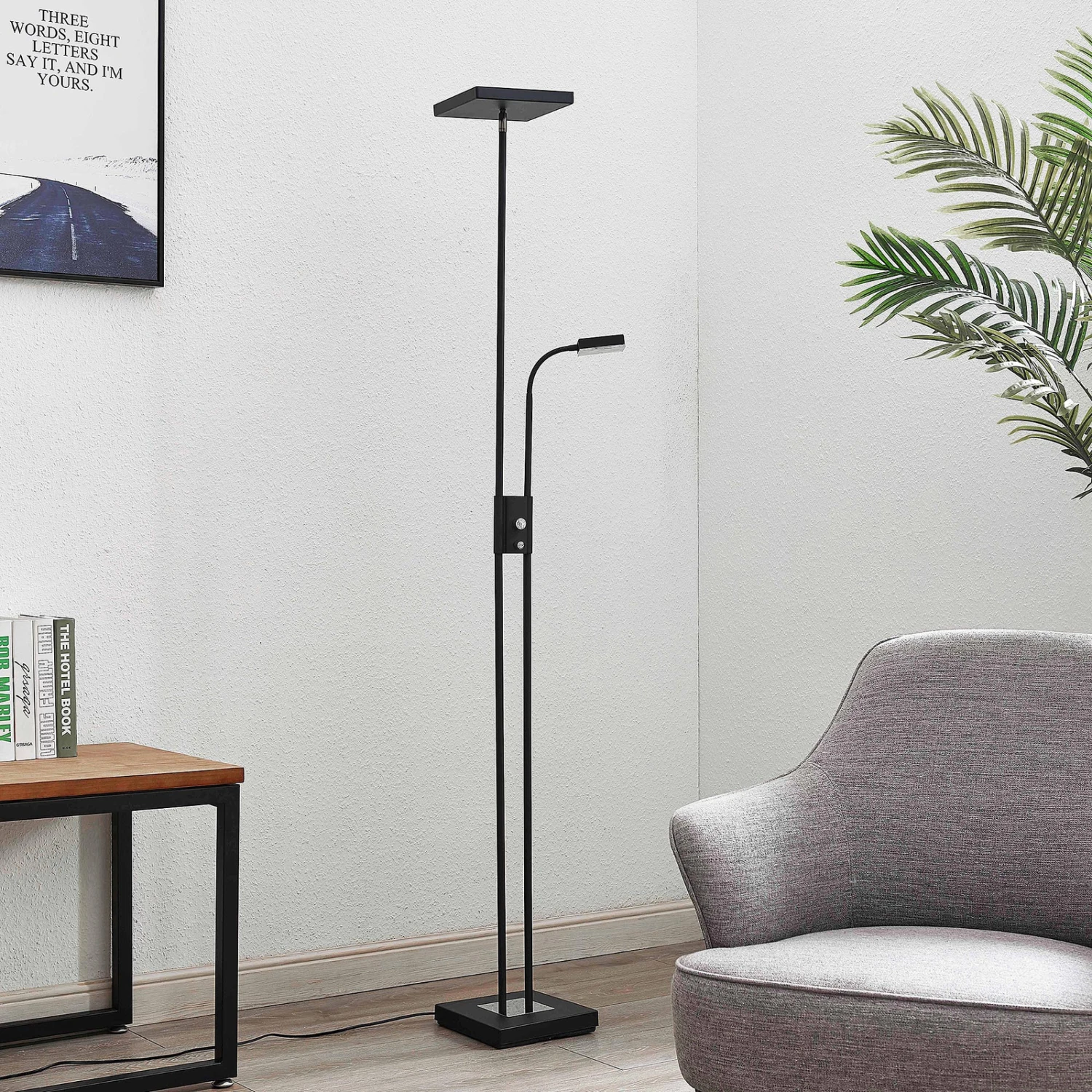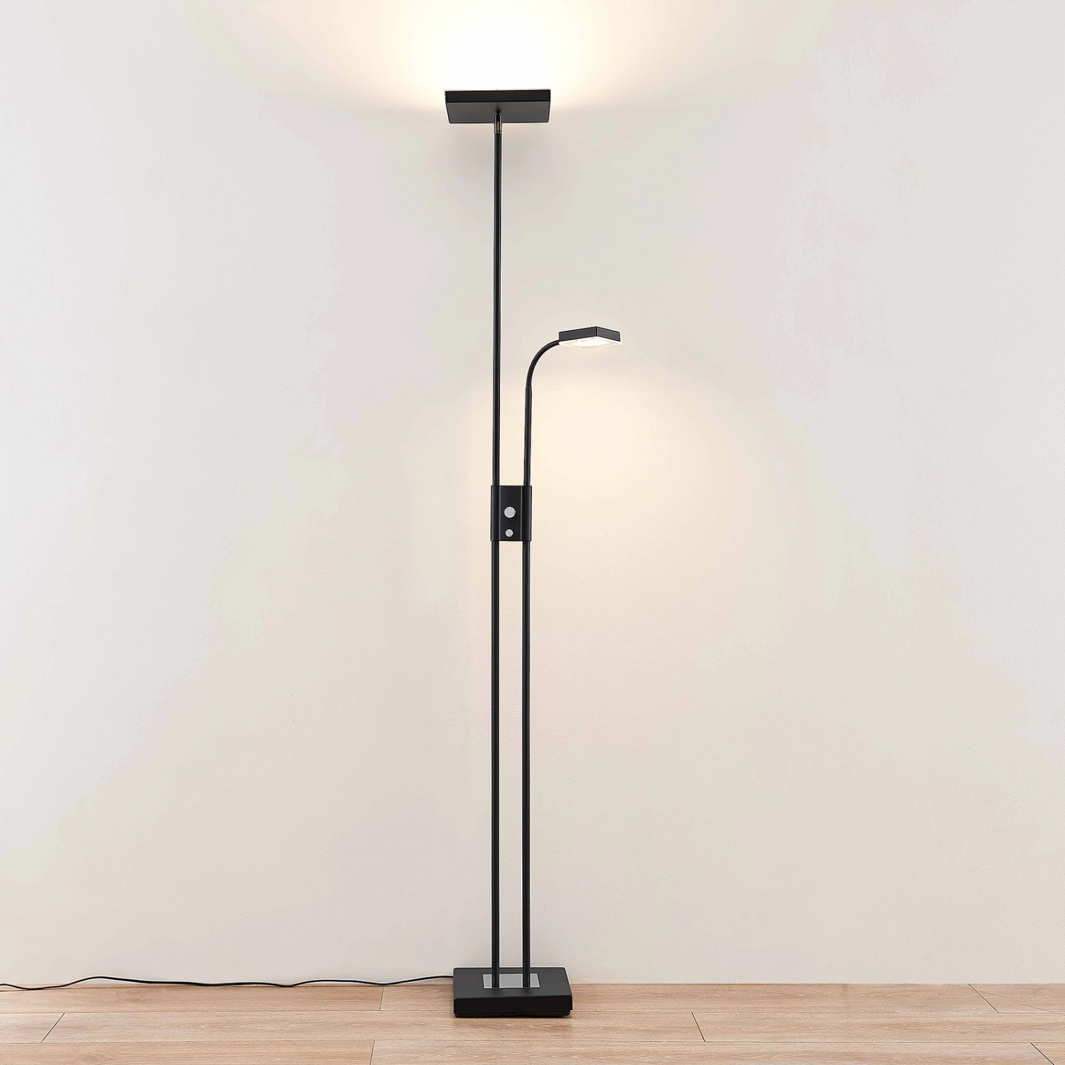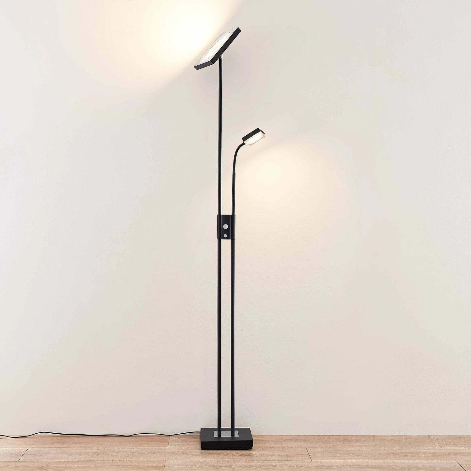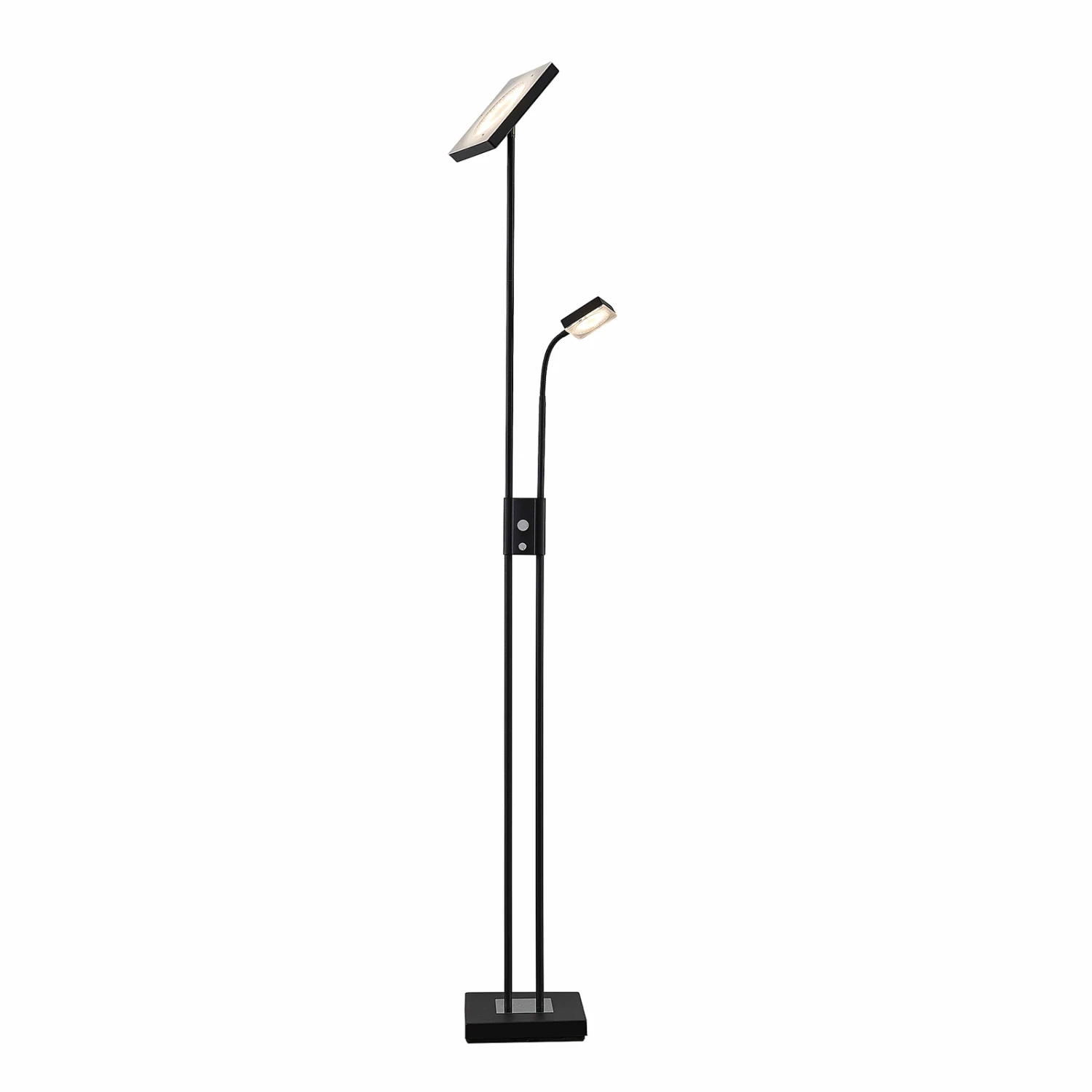 Le lampadaire LED Seppa au design noir est remarquable. Le lampadaire LED Seppa a une apparence carrĂ©e et marquante. Non seulement les deux sources lumineuses, mais aussi le pied du luminaire sont de forme carrĂ©e et forment ensemble un aspect gĂ©omĂ©trique uniforme. Les sources lumineuses directes et indirectes s’avèrent extrĂŞmement pratiques au quotidien et peuvent en outre ĂŞtre attĂ©nuĂ©es Ă l’aide de deux interrupteurs distincts. Seppa peut ĂŞtre utilisĂ© non seulement comme plafonnier, mais aussi comme lampe de lecture.