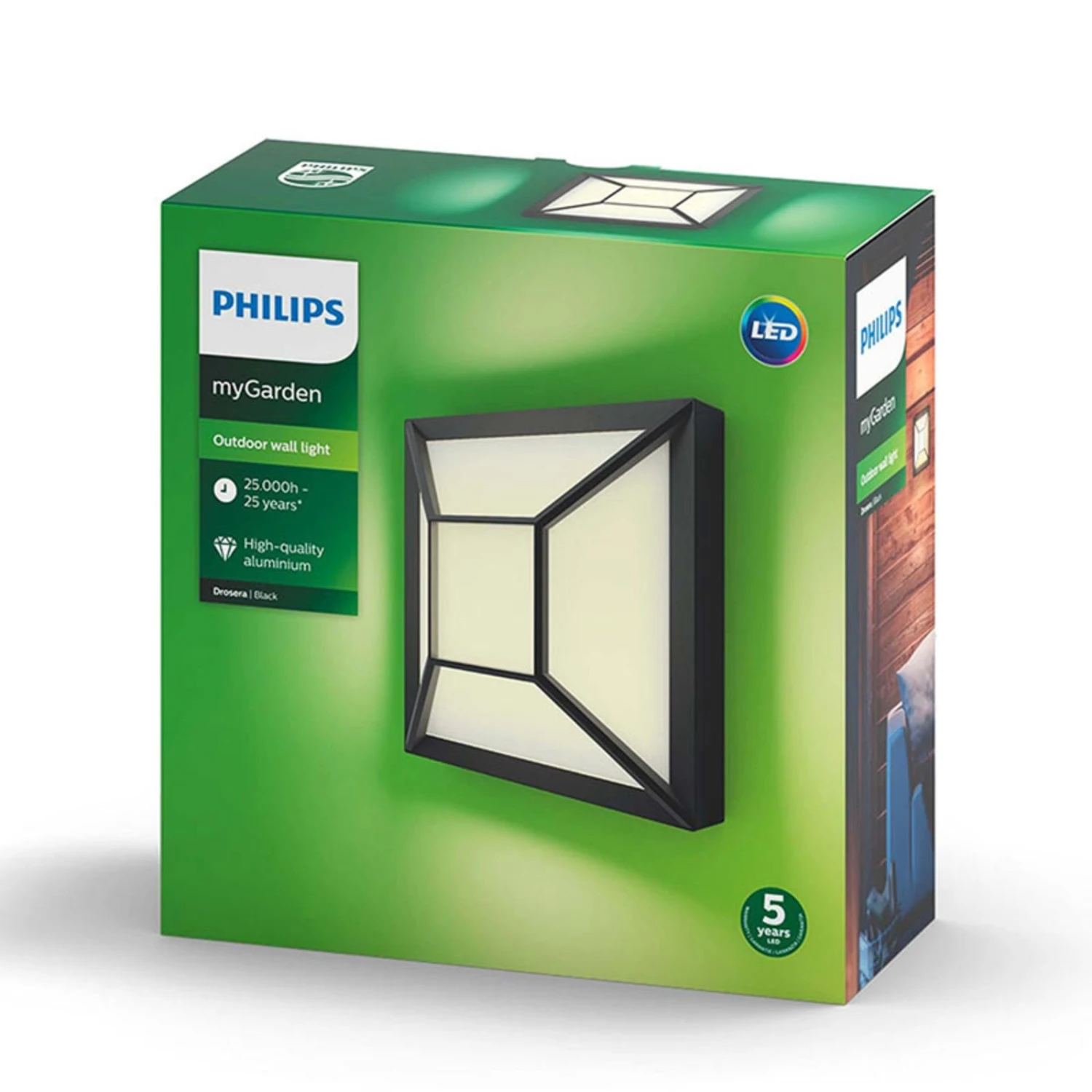 L’applique LED Drosera est presque carrĂ©e. Des tiges mĂ©talliques dĂ©passent sur le devant de la structure rectangulaire et subdivisent le diffuseur blanc en matĂ©riau synthĂ©tique en diffĂ©rents Ă©lĂ©ments graphiques. Elles le protègent Ă©galement des influences extĂ©rieures et donnent Ă la lampe un look dĂ©coratif. Comme source lumineuse, une platine LED a Ă©tĂ© installĂ©e dans l’abat-jour et diffuse une lumière blanc chaud pour un Ă©clairage efficace sur le plan Ă©nergĂ©tique et moderne. L’applique d’extĂ©rieur LED Drosera de la sĂ©rie myGarden de Philips peut Ă©galement ĂŞtre utilisĂ©e comme plafonnier.